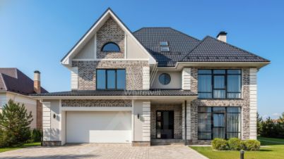 Чистые ключи. Трехэтажный коттедж площадью 425 м² расположен на полевом участке 13 соток. Здание представлено с чертами европейской архитектуры и отделано клинкерным кирпичом и штукатуркой в серых оттенках. Его фасад отличается выразительными линиями, созданными рустами, декоративными полосами и элементами, сопровождающими панорамные окна.