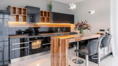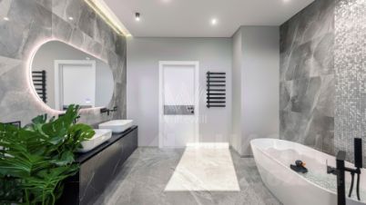 Дизайн интерьеров оформлен в стиле современной классики с использованием высококачественных материалов. На полу выложены паркетная доска, мрамор и керамическая плитка. Для создания уютной атмосферы продуманы различные варианты освещения, включая потолочные, лестничные и пороговые подсветки. Дом частично укомплектован мебелью на заказ от ведущих европейских производителей.