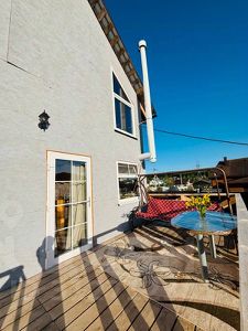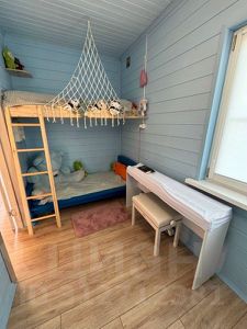 Первый этаж: холл, бойлерная, где установлена стиральная машина и морозильная камера, ванная комната и туалет, спальня и просторная кухня-гостиная с отдельным выходом во двор;