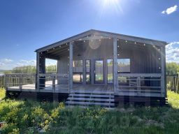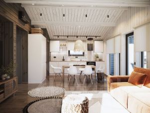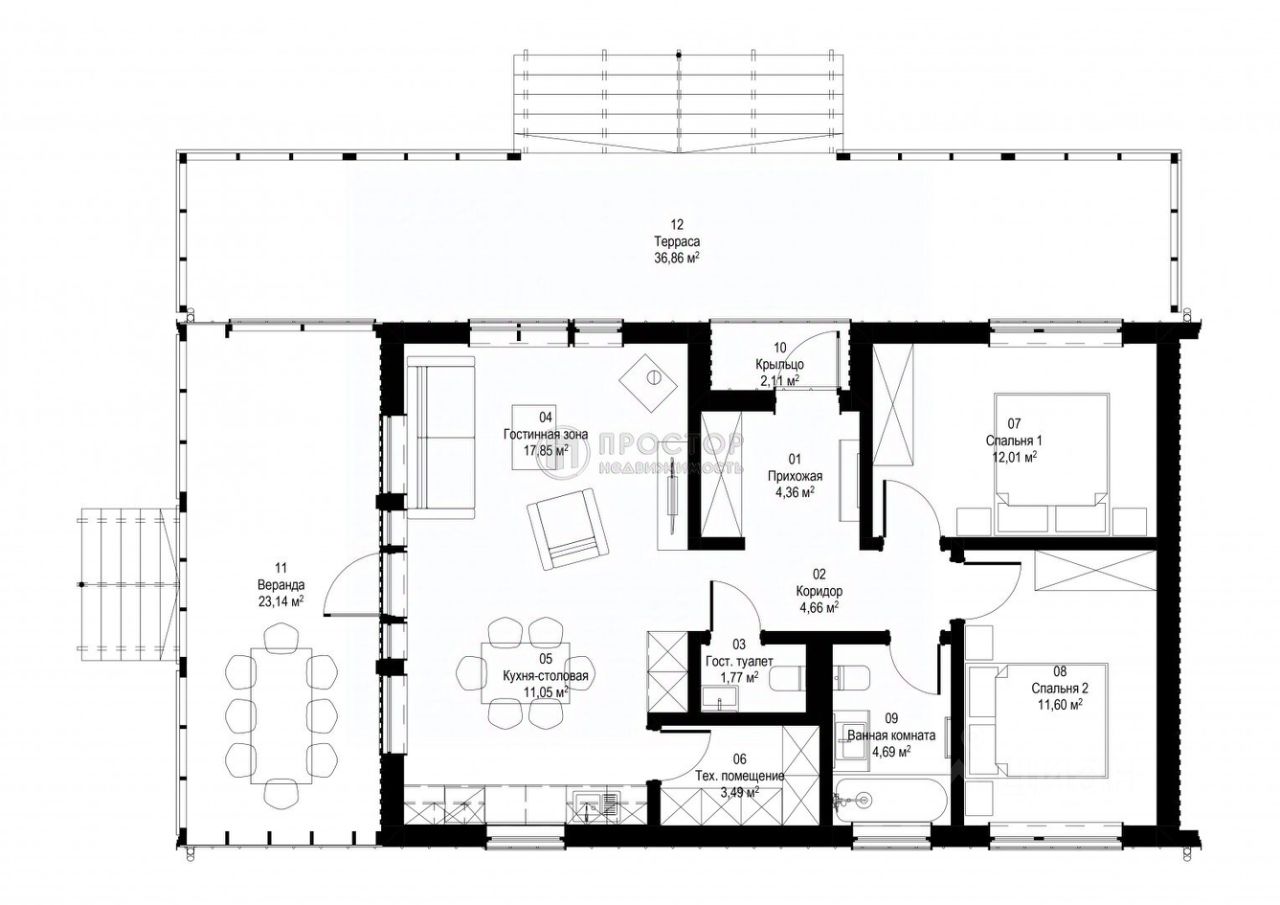 В доме 2 отдельные спальни, кухонная зона совмещена с гостиной, 2 санузла, техническое помещение. Большая веранда и терраса. Построен по современным стандартам.