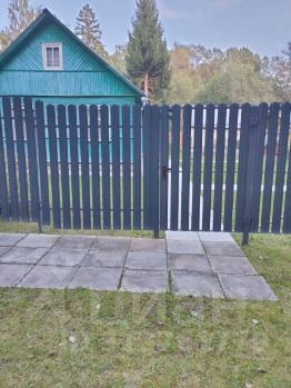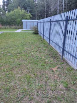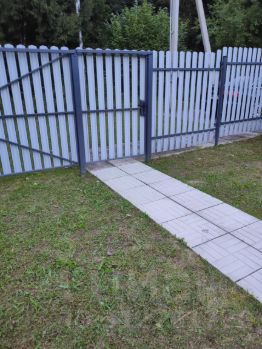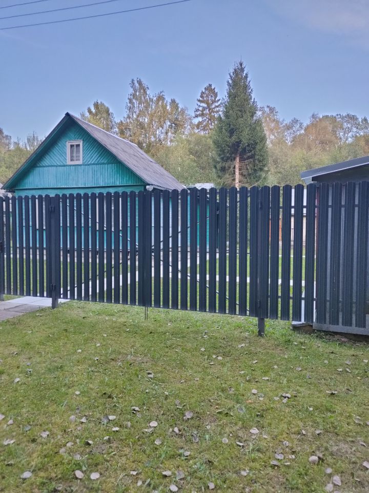 - Новый современный забор из металлического евроштакетника, калитка и ворота (МеталлПрофиль), от соседей - сетка Рабица.