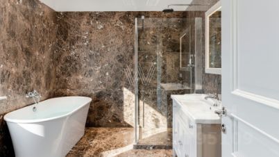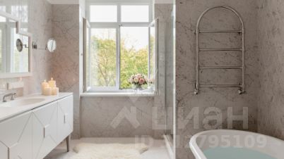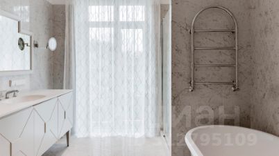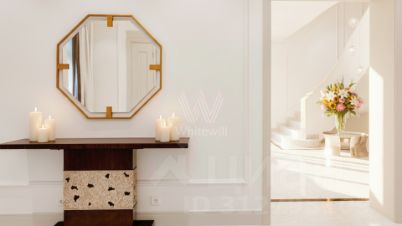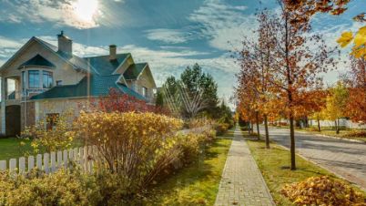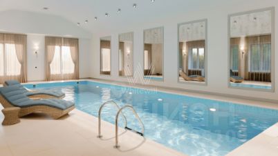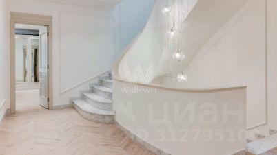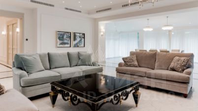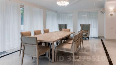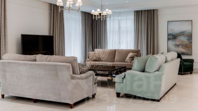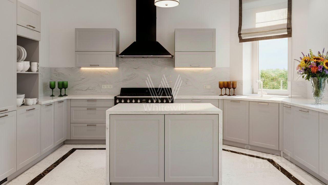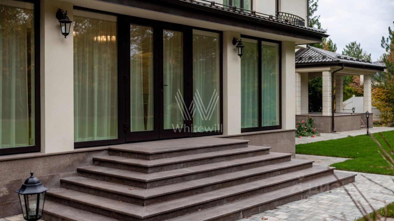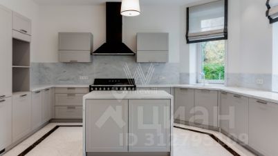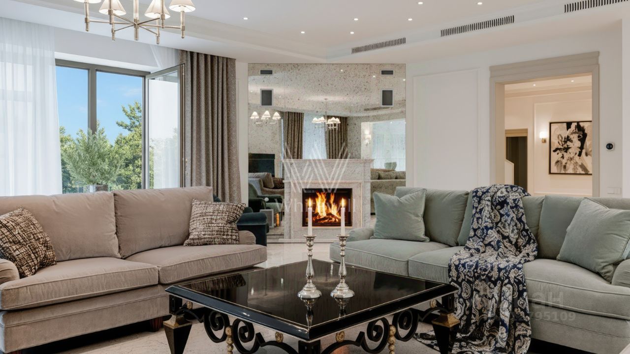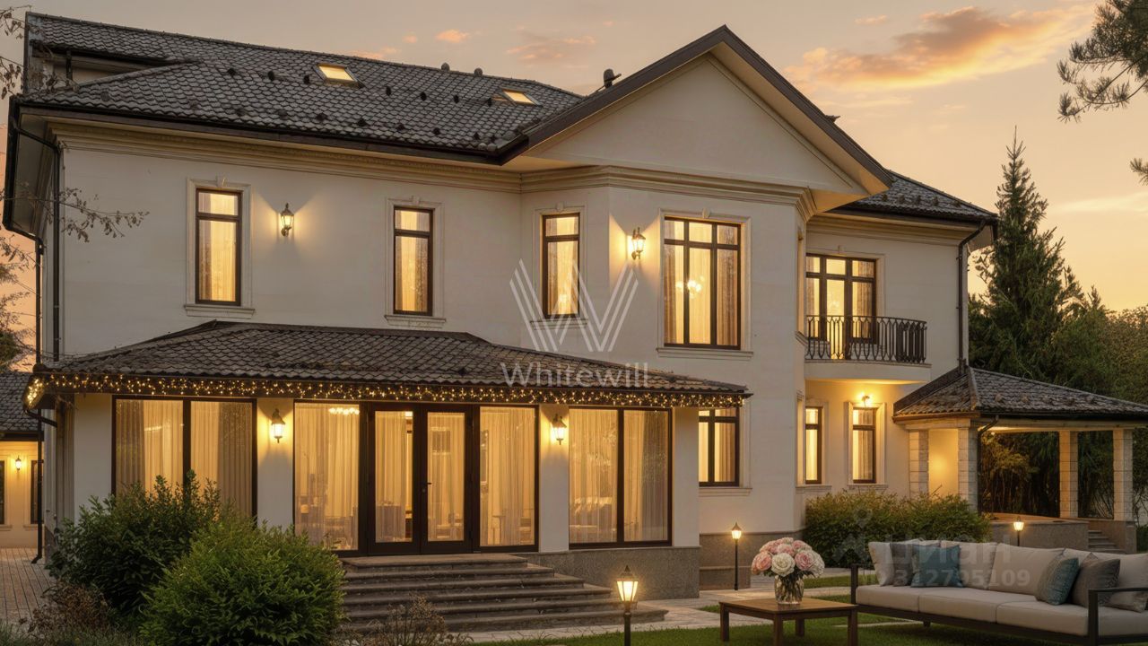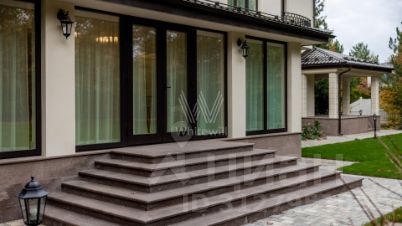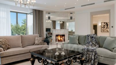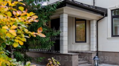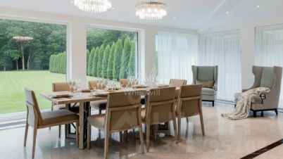 Резиденции Бенилюкс. Просторный загородный дом площадью 1250 м² построен на полевом участке 20 соток. Фасад в неоклассическом стиле облицован кремовой штукатуркой, темные окна декорированы наличниками. Интерьер оформлен в молочных оттенках, в отделке использованы мрамор и высококлассные материалы, установлена мебель. В резиденции разместили 6 спален, гостиную с камином, кухню, бассейн и сауну. На участке выполнен ландшафтный дизайн, вымощены дорожки, установлено уличное освещение.