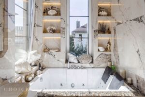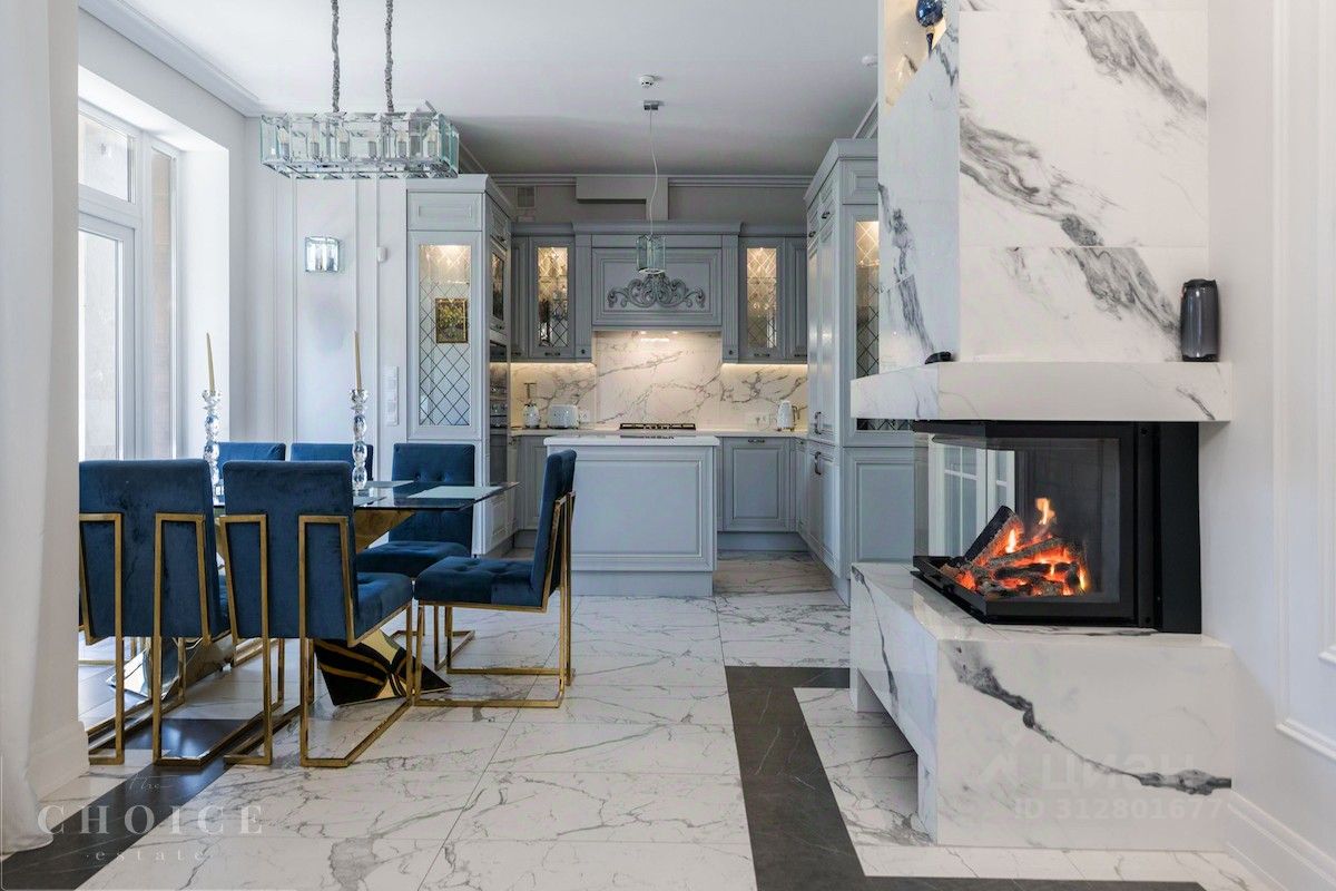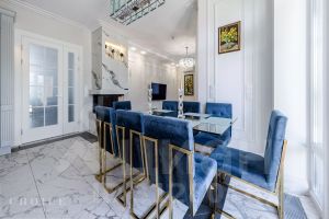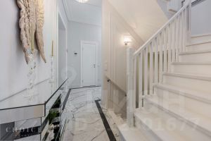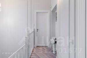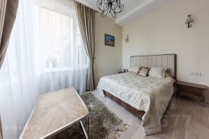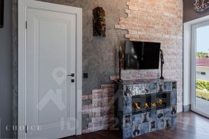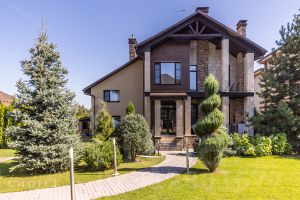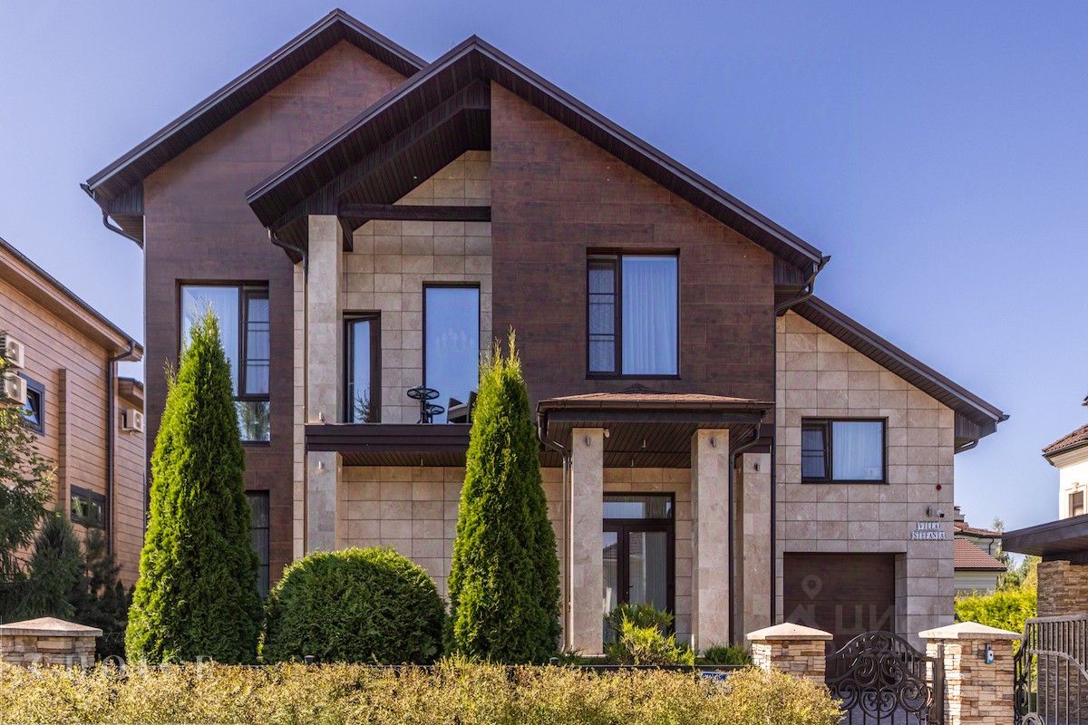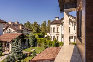 Загородный дом площадью 470 м² построен на полевом участке 11 соток в центре поселка, на второй линии от реки. Планировкой предусмотрены 5 спален, кухня-столовая-гостиная с камином, кабинет с камином, бильярдная, кинотеатр, баня на дровах. В контуре дома предусмотрен гараж на 1 машину. Рядом расположены навес на 2 машины и беседка с огнищем и кухней. На участке выполнены ландшафтный дизайн, высажены голубые ели и другие хвойные деревья, а также кустарники и бонсаи.