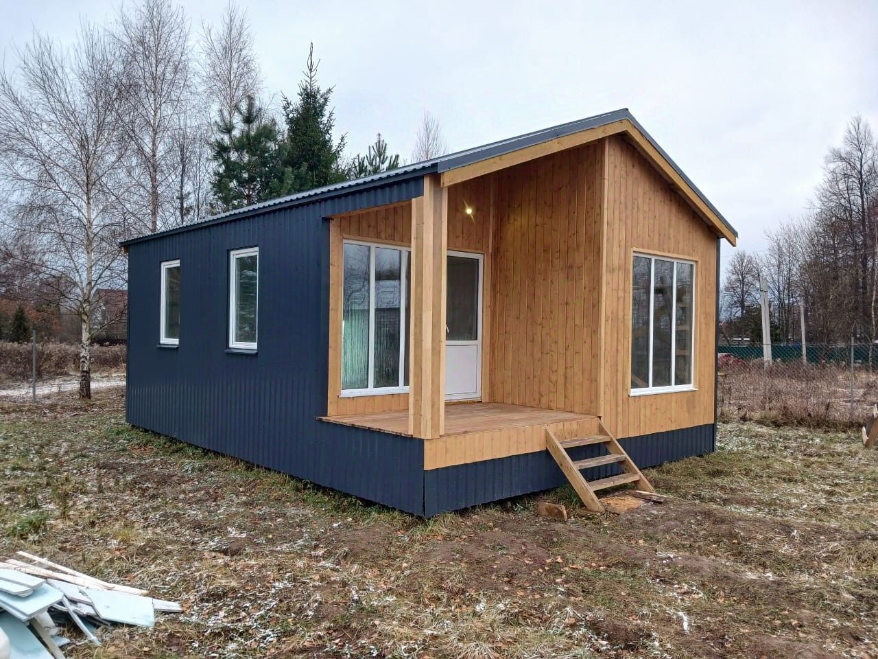 - Обшивка: каркас снаружи обшит ОСБ, что обеспечивает пространственную жесткость и отличную ветрозащиту. Декоративная отделка фасада имитация бруса, остальные стороны обшиты профилированным листом.