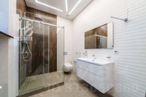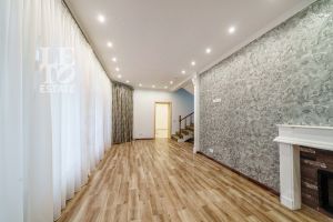 В основном доме на первом этаже можно оборудовать две спальни, на втором этаже три спальни. Отделка стен выполнена декоративной штукатуркой, использованы натуральные материалы для лестницы и дверей - дуб, пол - инженерная доска. Теплые полы разведены на первом этаже, на втором этаже в санузлах. Установлено кондиционирование.