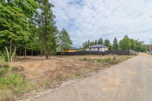- расчищен, ровный, есть несколько многолетних деревьев на самом участке, вокруг много зелени;