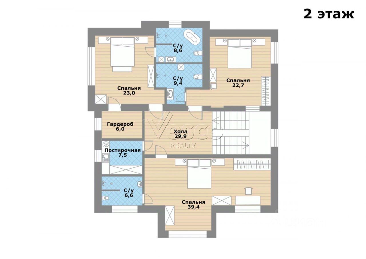 2-й этаж: 3 спальни, в каждой из которых полноценный санузел, две гардеробные, постирочная, просторный холл.