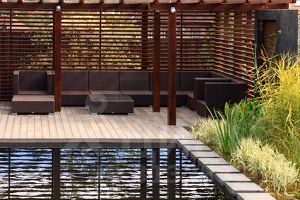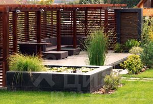 На участке ландшафтный дизайн с терассами и беседкой у водоема, оранжерея с мини огородом, детская площадка.