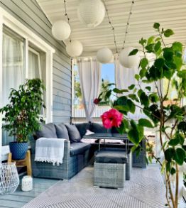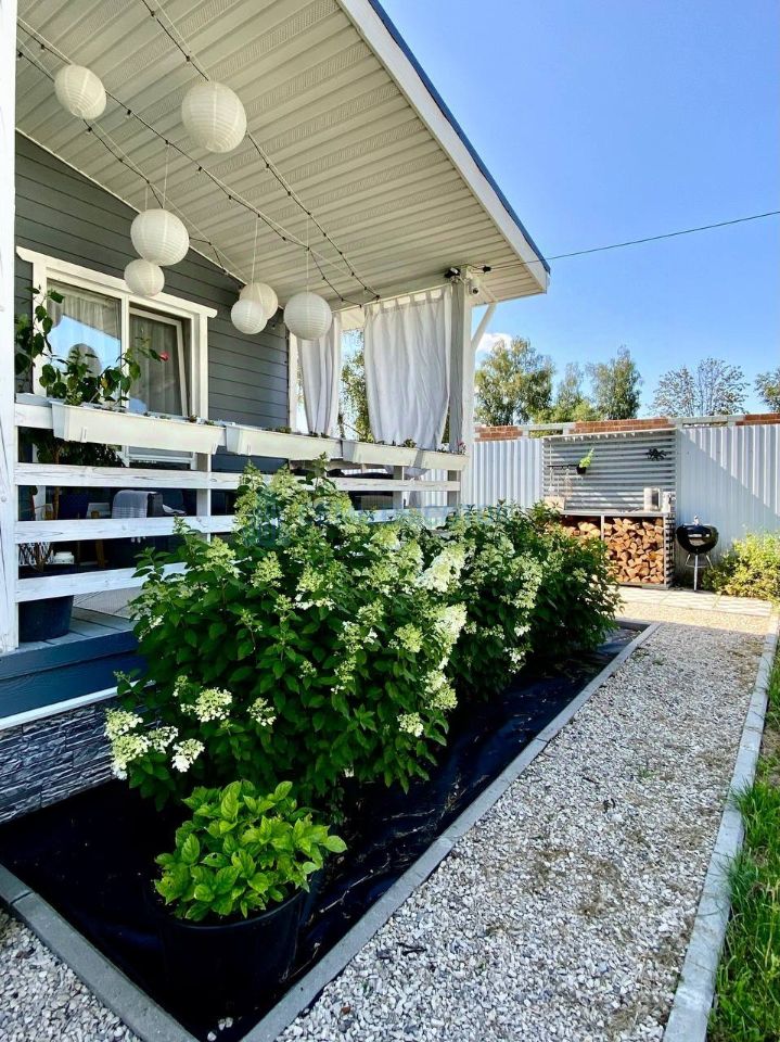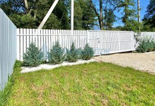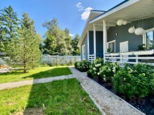 Со стороны заезда, место для парковки 2х автомобилей и дорожки отсыпаны мелким гравием, вдоль забора высажены деревья, между дорожек засеян карликовый газон, а перед входом растут две пушистые сосны высотой 6-6,5 м.