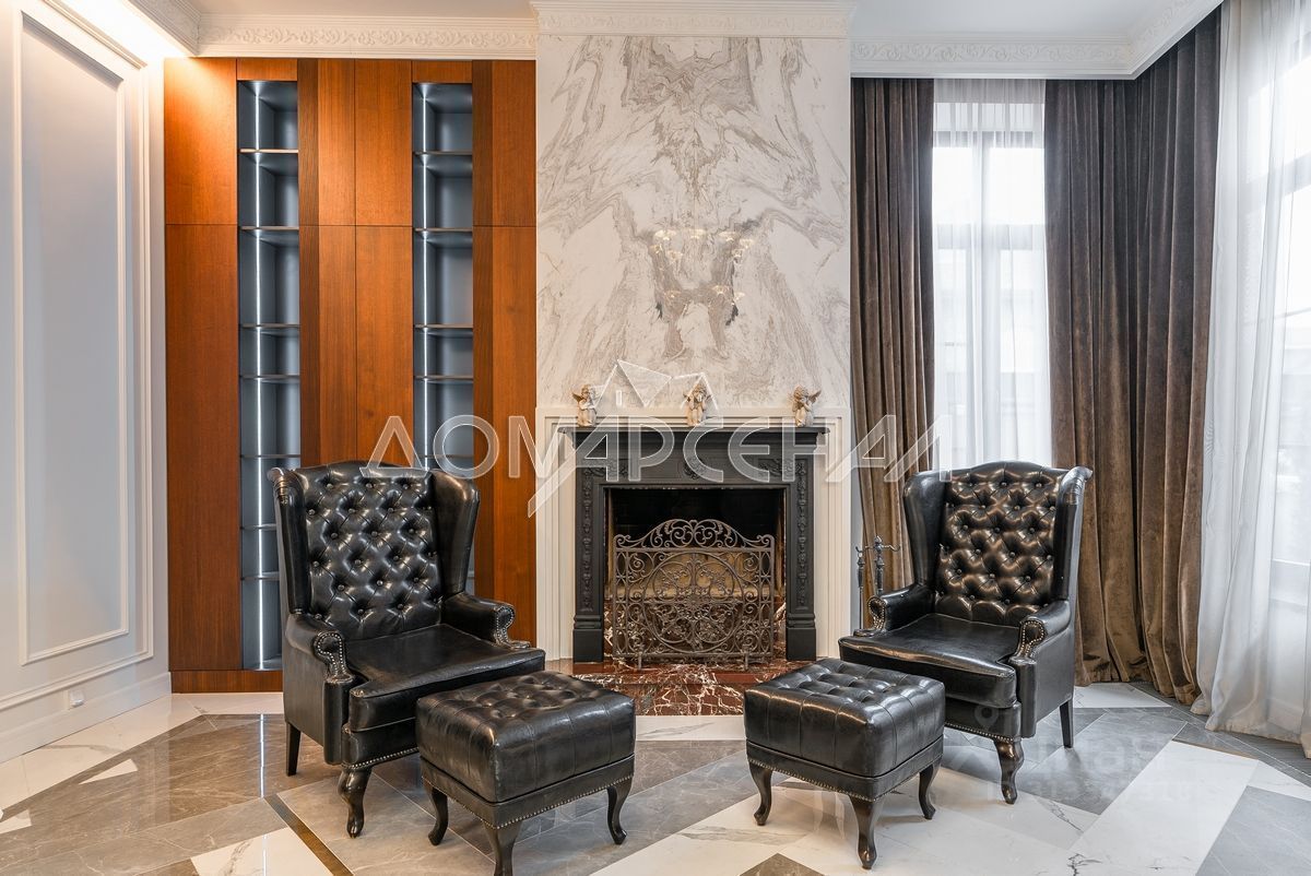 • Два кожаных кресла с пуфами в стиле Честерфилд у камина создают уютную и комфортную зону отдыха