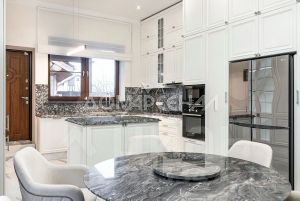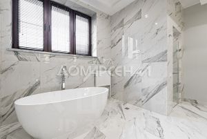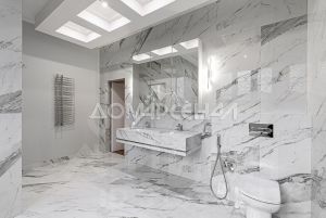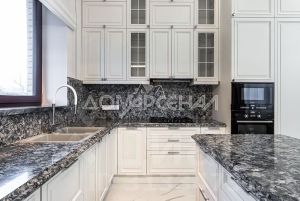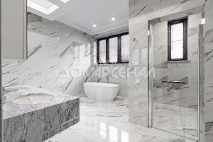 • Подоконники, столешницы в ванной, стол на кухне, панно над камином и за телевизором в зале выполнены из натурального мрамора