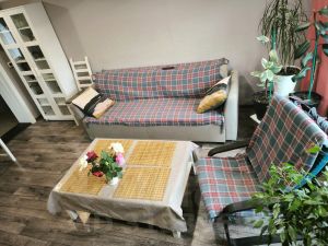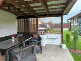 На 1 этаже :Гостиная, спальня , кухня, санузел, коридор , гардеробная. На 2 этаже- 2 спальни. На участке есть баня с дровяной печью, двумя комнатами отдыха и душевой ( заведен водопровод и установлен водонагреватель для горячей воды ) .Также имеется два хоз блока, теплица закрытая, беседка .
