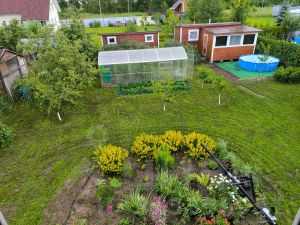 На участке высажены туи. Плодоносящие деревья и кустарники : яблони , груши , жимолость, кусты малины, , смородины .