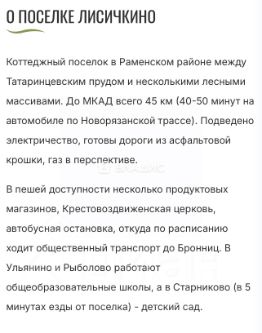 Посёлок Лисичкино располагает хорошей экологией, удалённостью от городской суеты и в то же время прекрасной транспортной доступностью.До МКАД 50 МИНУТ. Удобный выезд на основные направления и близость к центрам досуга и необходимой инфраструктуры делают это месторасположение крайне привлекательным.