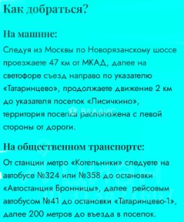 Природа и свежий воздухРека Отра всего в 200 метрах и Татаринцевский пруд в 600 метрах от поселка создают идеальные условия для отдыха у воды. Близлежащие леса лес Подлипки и лес Горный, подарят возможность наслаждаться прогулками, собирать грибы или устраивать пикники.Удобства для жизниПоселок спроектирован так, чтобы всё важное было поблизости. Продуктовые магазины в 5 минутах ходьбы позволят быстро купить всё необходимое, а садовый центр в 10 минутах пешком упростит озеленение участка. В деревне Стариково, всего в 5 км, находится средняя школа, а для активного досуга рядом работают пейнтбольный клуб "Борец" и конноспортивный комплекс "Татаринцево".Всё для здоровьяМедицинская инфраструктура доступна в городе Бронницы: доехать на автомобиле можно за 10-15 минут или за 30 минут на автобусе, остановка расположена прямо у поселка.