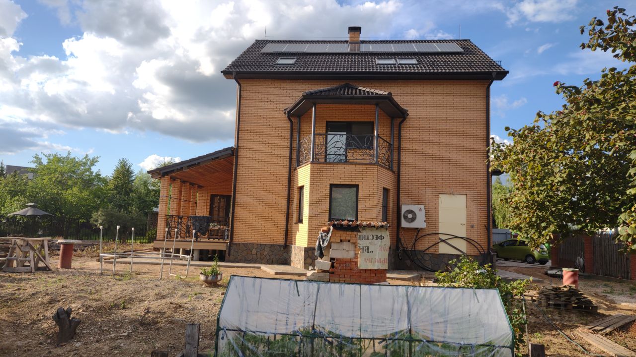 Новая Москва. Возможность прописки. Трехэтажный дом площадью 352,8 кв.м. на участке в 20 соток (заборы соответствуют межеванию). Закрытая и охраняемая территория СНТ. Септик, вода - скважина, водоочистка. Отопление: газ (42 кВт vitogas) или электричество. Полимерпесчаная черепица. Фундамент ленточный, монолитный. Отмостка монолит, облицована натуральным камнем (вместе с цоколем). Внешние стены: облицовочный кирпич, утеплитель, блок, тепл. штукатурка, ГВЛВ. Перекрытия: 1ый и 2ой эт: ж/б плиты, 3ий эт: монолит, гараж: монолит. Окна: массив, дерево, двойной стеклопакет, двойное открытие. Двери: вход - массив, дуб, внутренние - массив, секвойя. В гараже приточно-вытяжная вентиляция с тепловой приточкой и электронным управлением. Кондиционеры инверторные (7 шт.) На 1ом эт. - теплый водяной пол. На террасе (под панорамными окнами) радиаторы в полу. Бойлер на 200 л. греется системой отопления. Вокруг дома дренаж с откачкой воды за пределы участка. Три варианта электропитания: СНТ (15 кВт, 3 фазы), трансформатор (прямой договор Мосэнерго, 50 кВт, 3 фазы) или солнечные батареи (автономный режим). Разводка Интернет (входящее оптоволокно) и ТВ по дому. Охранная и пожарная сигнализации с объемными датчиками. Ковка на балконах, террасе и в доме. Отделка в доме: пол - массив орех, дуб, палисандр, плитка; стены - декорат. штукатурка, плитка; с/у - плитка; потолок - разноуровневый, крашенный; подоконники - иск. камень; свет - балки (дуб) со светодиодами. Действующий камин из кирпича. 4 мансардных окна. Лестница: монолит, ступени - массив дуба; подсветка ступеней по датчикам движения. На участке: