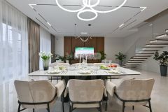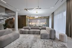 1 этаж: Кухня-столовая- гостиная, котельная, гостевая спальня, санузел, квартира персонала, зона спа с душевой, сауной и выходом на участок, санузел, постирочная, гардеробная, котельная, гараж на 2 машиноместа.