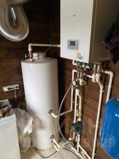 Отопление электрокотел+батареи, залит антифриз, в санузлах подогрев пола (водяной от котла). Для горячей воды бак косвенного нагрева 200л.