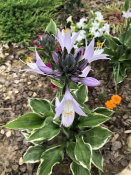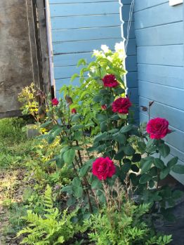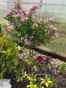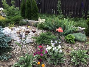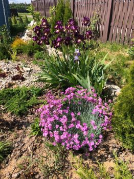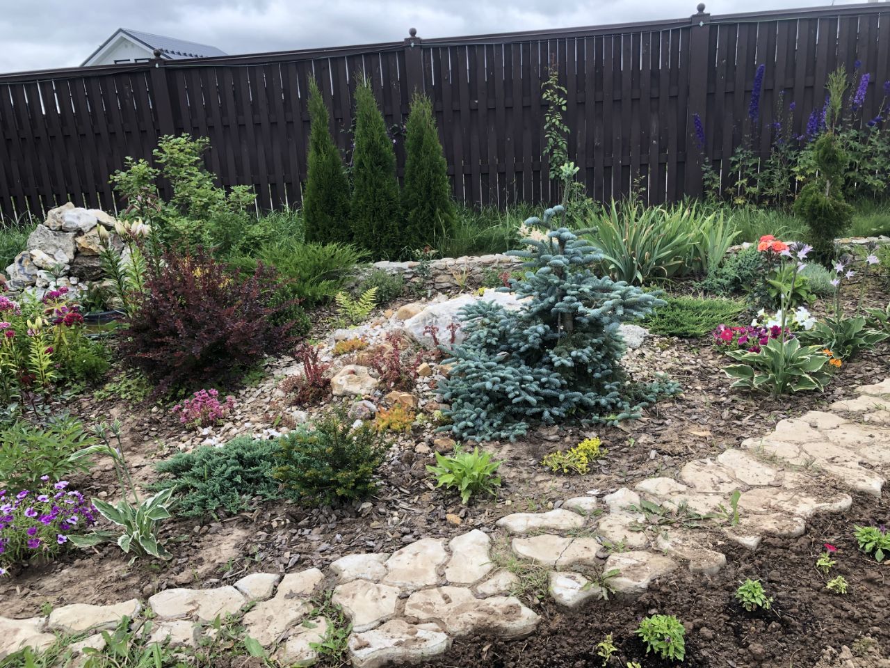 Посажены фруктовые деревья, кусты смородины, много цветов, хвойники.