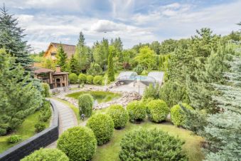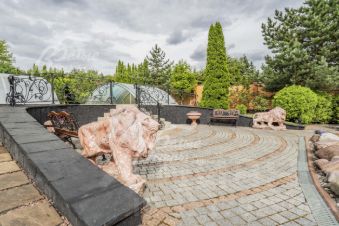 Благоустройство участка: выполнен ландшафтный дизайн: на участке более 50 взрослых деревьев (ели, сосны, туи, липы, фруктовые деревья), множество мелких деревьев и кустов, розарий; искусственный пруд с рыбой, обложен натуральным камнем, фонтан, лавочки, мраморные скульптуры; дорожки вымощены из натурального гранита, организовано освещение участка.