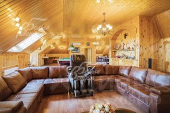 Описание внутренней отделки: стены оштукатурены, покрашены, оклеены обоями, в санузлах плитка, на мансарде — дерево; пол - качественный ламинат, плитка; потолки отделаны гипсокартоном (двойной), оштукатурены, с многоуровневой подсветкой; лестничный марш с бетонным основанием, ступени отделаны мраморной плиткой, изящные кованые перила, поручни из ценных пород дерева; деревянные двери.