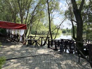 В 200 м от тpасcы, машин не слышно. В 5 минутах пешком магазины, кафе, аптеки, ПВЗ, автобусная остановка, ресторан на озере, баня.