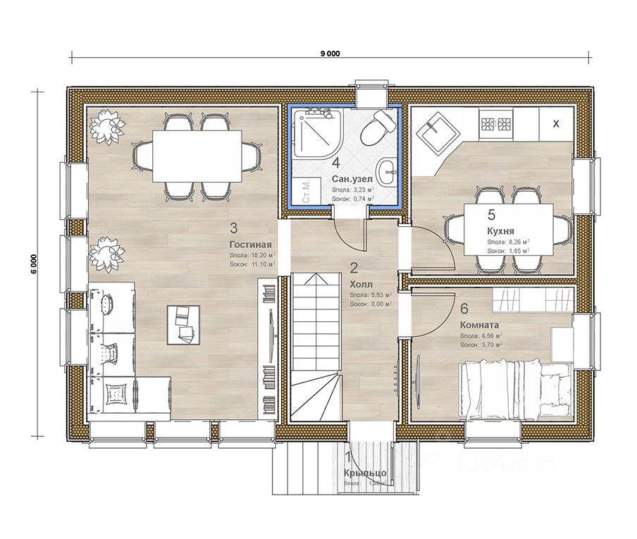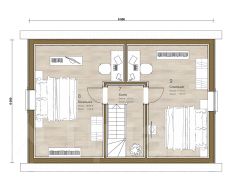 Планировка: кухня гостинная 19 кв.м. с выходом на террасу, санузел 4 кв.м, спальня 9 кв.м., кабинет 7 кв.м., мансардный этаж 2 спальни по 18 кв.м. и гардеробная комната.