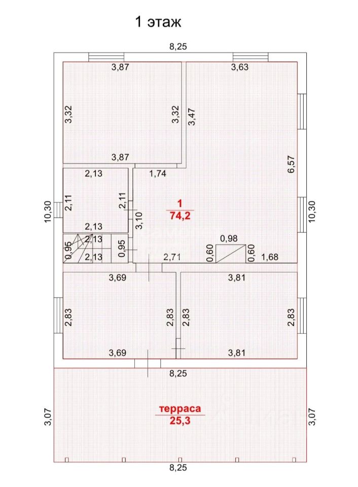 1 этаж: прихожая, комната 12 кв.м. кухня гостинная, совмещенный сан узел с душевой кабиной.