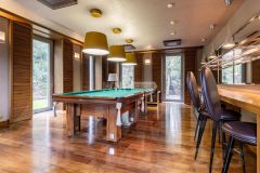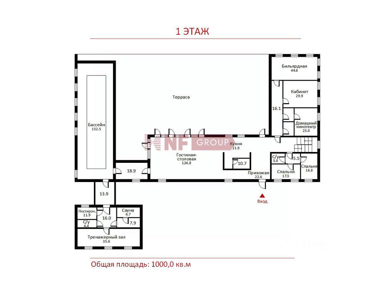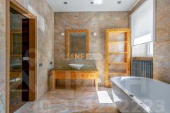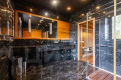 1 этаж: холл, гардеробная, гостиная с камином и выходом на террасу; зона столовой, кухня, с/у гостевой, домашний кинотеатр, кабинет, бильярдная с баром; блок: 2 спальни с с/у; зона СПА: бассейн 18м, парная, с/у, спортзал; полностью оборудованная прачечная, терраса с зоной барбекю.
