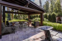 Есть ГАРАЖ на 3 авто с квартирой для персонала, крытая беседка с патио, кухней-гостиной, с/у.