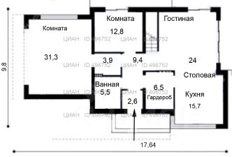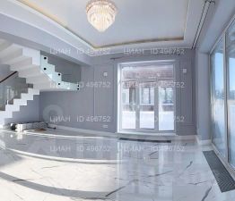 Высота потолка первого этажа 3 м. Гостиная-столовая-кухня более 60 метров.