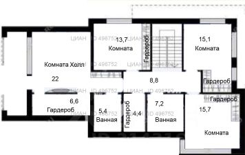 Всего 5 спальных комнат (+1 комната), 3 санузла, 3 гардеробные