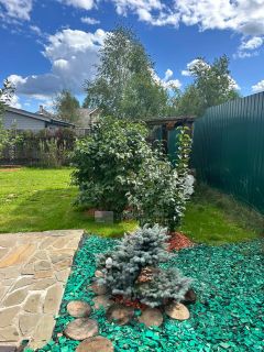 Выполнен ландшафтный дизайн, посажены молодые яблони, вишни, груши, крыжовник, смородина, малина, ежевика, жимолость, сирень,