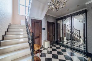 В доме теплые полы в холле, тамбуре и санузлах, покрытие полов - массив дуба и ясеня и керамогранит, внутренние двери - натуральный орех, дизайнерская отделка помещений.
