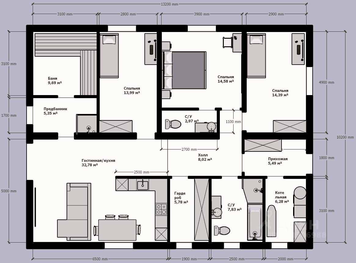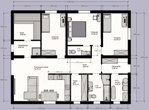 В доме: очень светлая просторная гостиная, 3 комнаты, одна из которых мастер спальня с отдельной ванной комнатой, большая ванная комната и санузел, отдельная гардеробная комната, котельная, просторный холл, ну и конечно сауна на дровах отделанная липой, очень красивая и уютная с отдельным душем и выходом на открытую веранду.