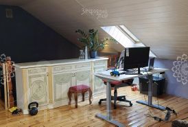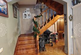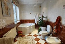 Построен из газобетонных блоков с утеплением, снаружи оштукатурен и отделан декоративным камнем. Фундамент - железобетон, кровля - утеплённая металлочерепица. Планировка рассчитана на проживание большой семьи: С крытого крыльца попадаем в дом. На первом этаже кухня - столовая и просторная гостиная с большим, украшенным изразцами камином, санузел с душевой кабиной и сауной, подсобное помещение. Есть вход в дом из тёплого гаража на 2 машины. Второй этаж - 3 спальни, постирочная, санузел с джакузи и огромная комната - верхняя гостиная, в которой можно оборудовать ещё 2 спальни или кабинет. Мансардный этаж площадью во весь дом, утеплён. Там находится бильярд и спальное место. Коттедж продаётся с мебелью и техникой.
