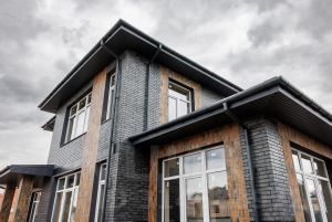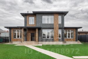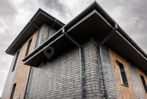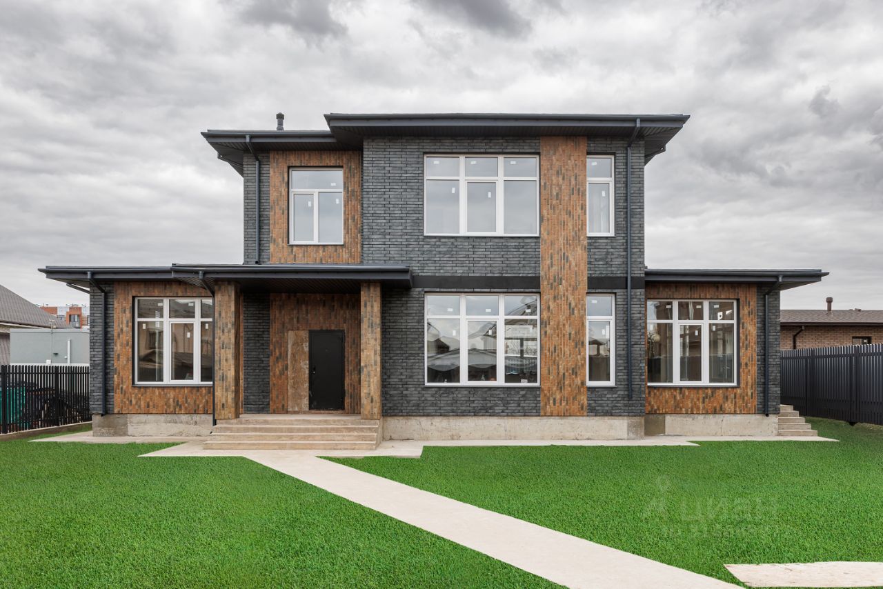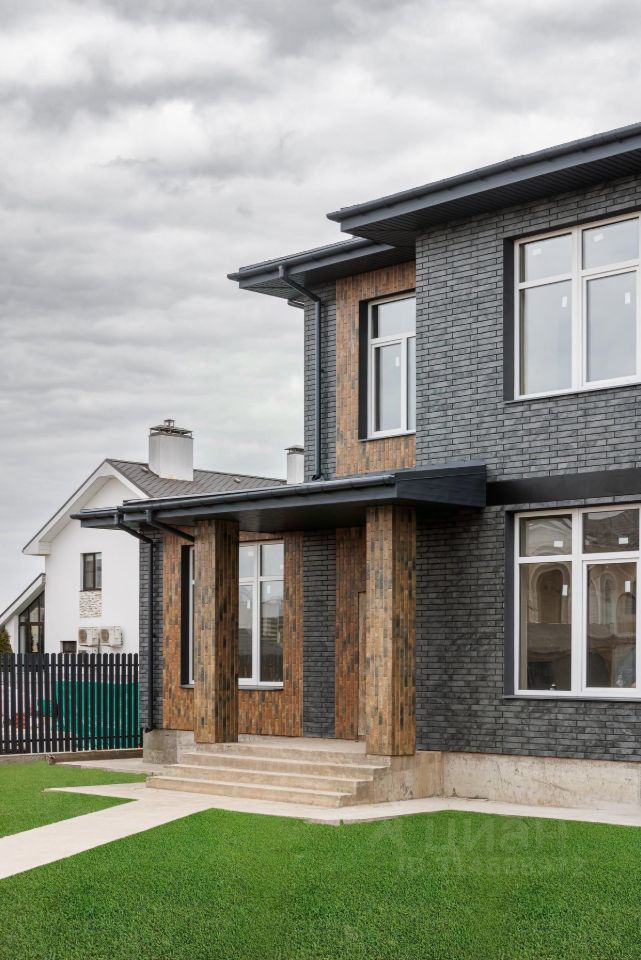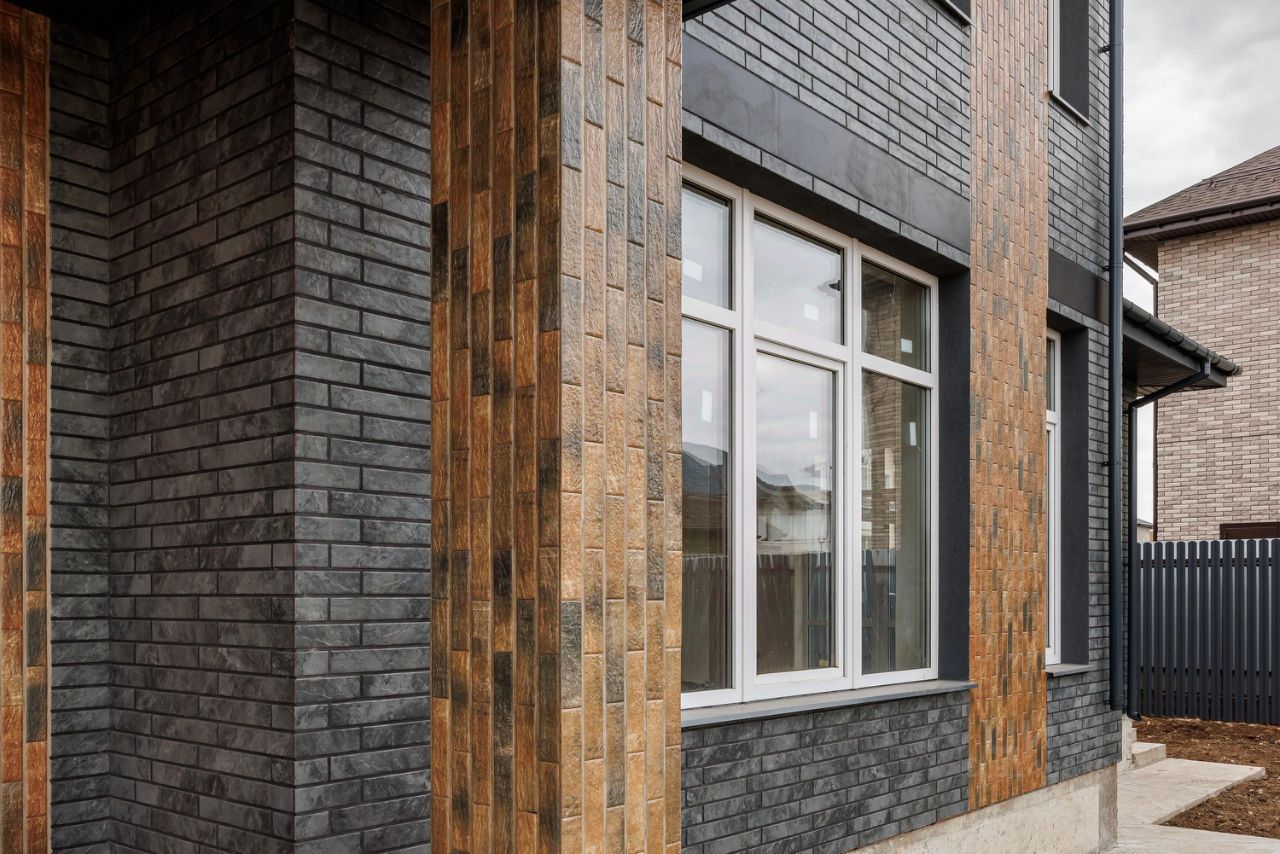 Фасад дома сделан из глиняной клинкерной плитки. Крыша мягкая черепица. Установлен забор по всему периметру из штакетника, автоматические ворота, калитка, площадка для двух машин.