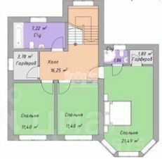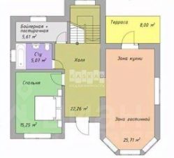 1 этаж: холл, кухня-гостиная с выходом на веранду, спальня, санузел, бойлерная;2 этаж: 3 спальни, 2 санузла, 2 гардеробные;