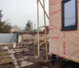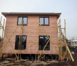 - Черновая отделка: фасад ОСБ + Изоспан, стены 200 мм (тепло будет даже в зимний период), внутри армированный гипсокартон.