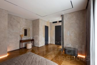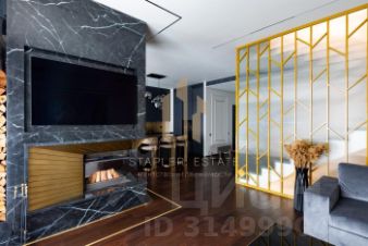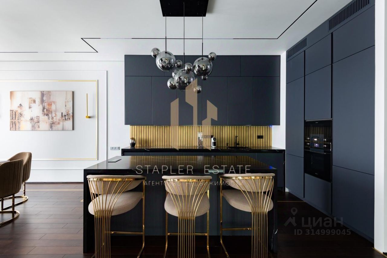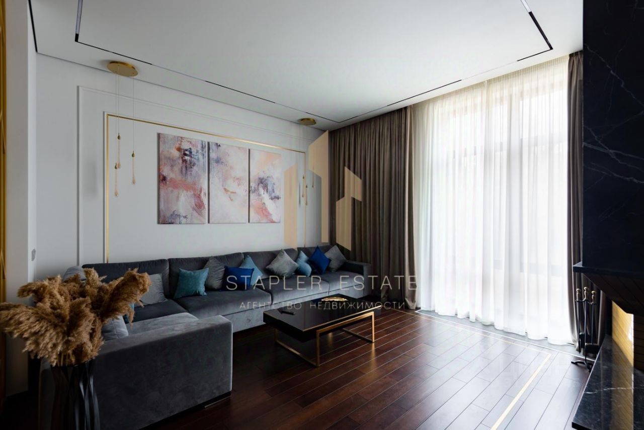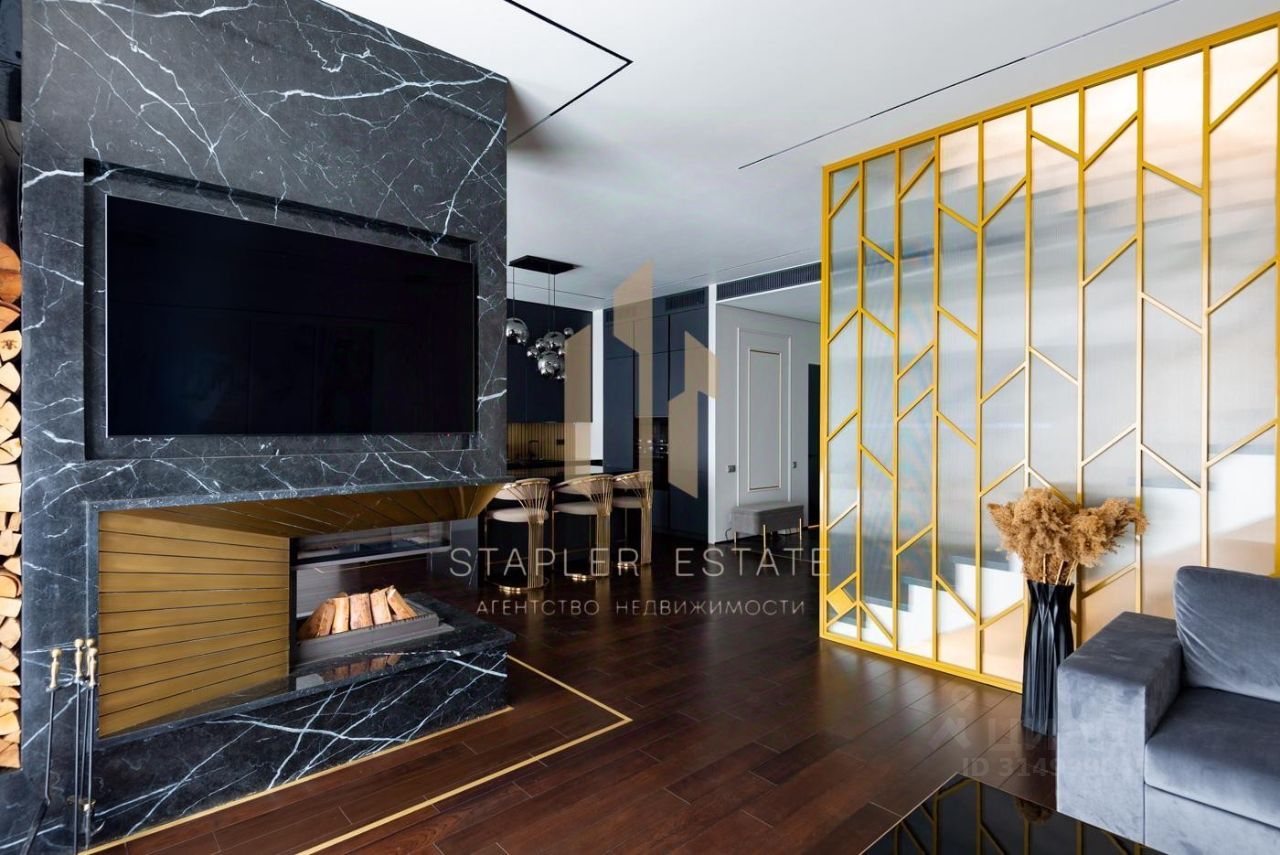 Внутреннее пространство оформлено в современном стиле с использованием премиальных материалов. В гостиной установлен дровяной камин с отделкой из латуни. Панорамные окна и потолки высотой 3 метра создают ощущение простора и наполняют пространство светом. Из окон открываются живописные виды на собственный двор и внутреннюю территорию комплекса.