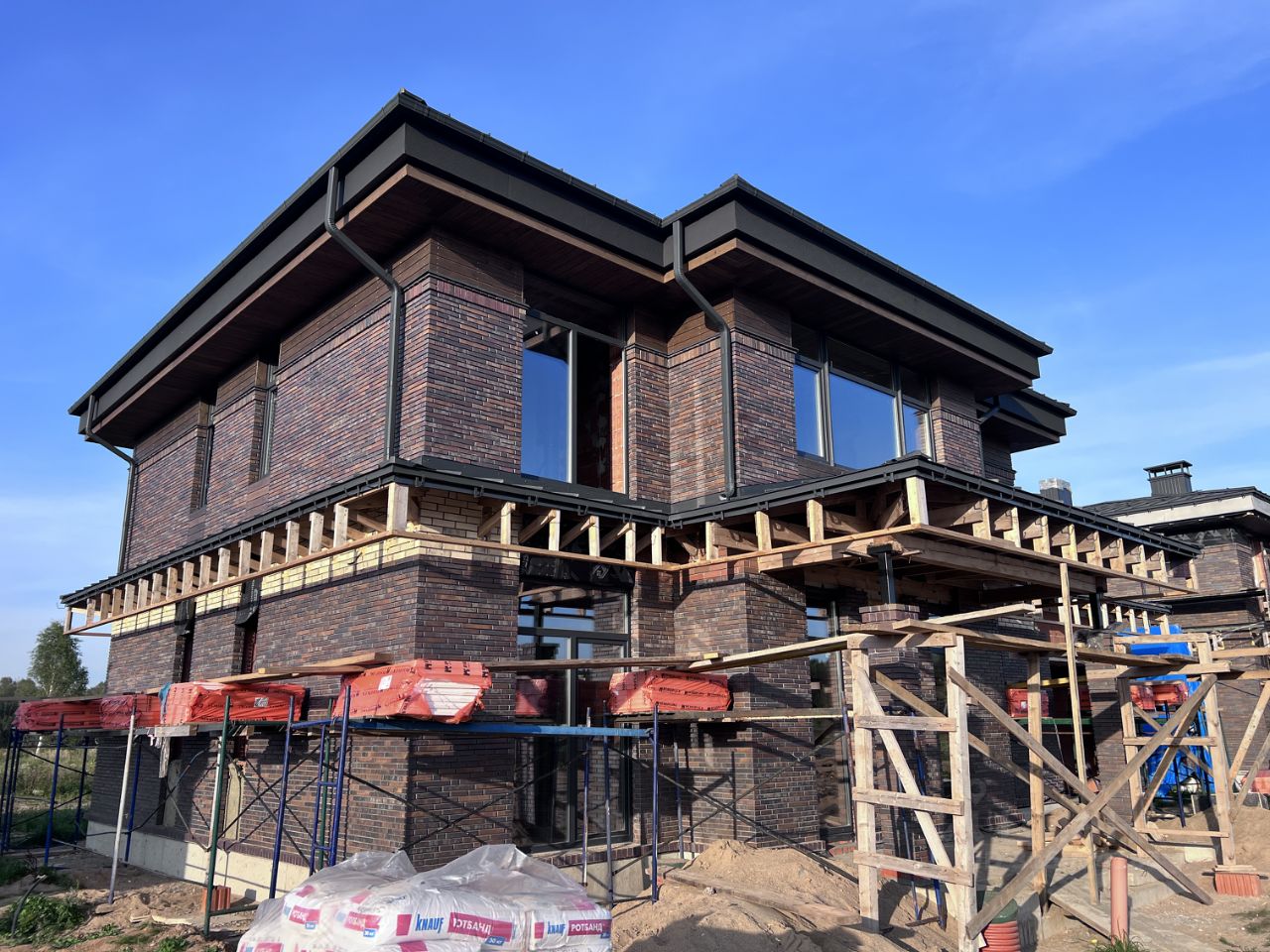 Дом площадью 275 квадратных метров построен на земельном участке 14,91 соток. Особенностью проекта является геометрия свесов кровли. Образующиеся навесы над крыльцом, террасой и парковочным местом увеличивают полезную площадь и