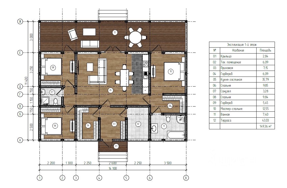 Клубный посёлок Возрождение предлагает вам проект комфортного и уютного одноэтажного дома Дельта общей площадью 149,36 м2 с тремя спальнями и просторной террасой. Это идеальный выбор для семьи.