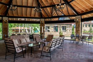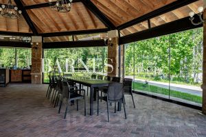 От главных домов по вымощенным дорожкам в сторону леса вы попадаете в полностью готовый, обустроенный уютный домик - барбекю площадью 79 кв.метров с очагом, зоной отдыха для теплых встреч в семейном, дружеском кругу.