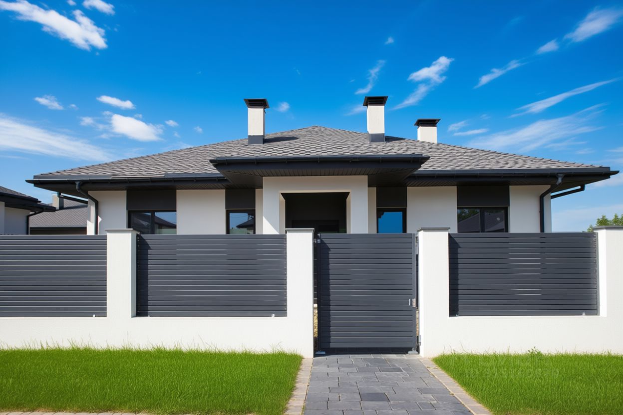 Капитальный забор на ленточном фундаменте с окраской с единой цветовой концепции проекта по парадному фасаду, забор из металлического штакетника между домами.