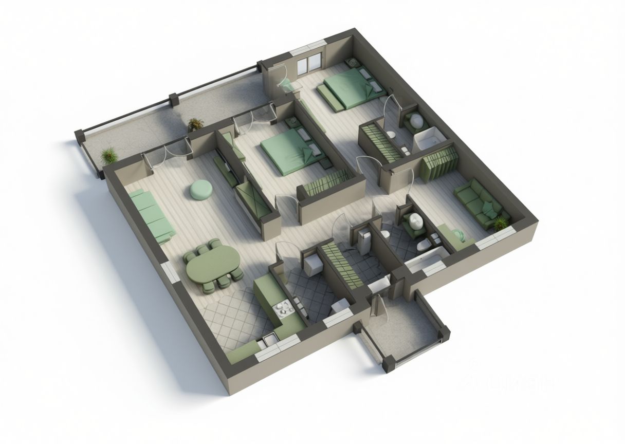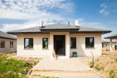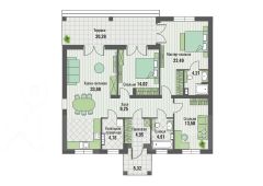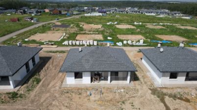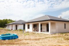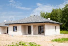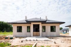 Строительство дома по собственному проекту застройщика: большая кухня-гостиная, 2 классические спальни, мастер-спальня с гардеробной и санузлом, общий санузел, котельная-прачечная и прихожая.