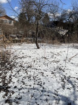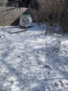 На участке растут плодовые деревья и кустарники: три яблони, шиповник, крыжовник.