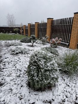 В саду растут хвойные культуры: туи, можжевельники и несколько видов сосен.