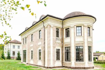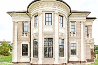 Материал стен: кирпич. Облицовка стен: искусственный камень + много декора в облицовке дома (колонны, пилястры, балюстрады, капители, картины).