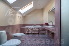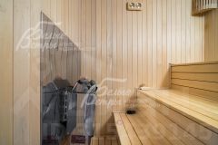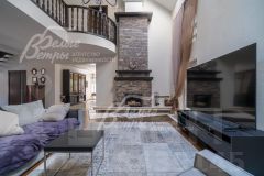 Описание внутренней отделки: выполнена стильная внутренняя отделка из премиальных высококачественных материалов. Стены покрашены, отделаны декоративной штукатуркой, в спальнях частично оклеены обоями, в санузлах плитка. Полы из паркетной доски и керамогранита, под керамогранитом и в санузлах тёплые полы. Портал камина и часть противоположной стены отделаны мрамором Emperador Dark (Испания). В доме подвесные потолки, двери и подоконники из массива дуба. На второй этаж из холла ведёт дубовая лестница. Вход в отдельную жилую зону по бетонной лестнице, отделанной керамогранитом. Бассейн отделан мозаикой.