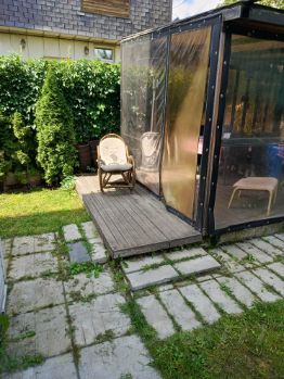 Из гостиной выход на придомовую территорию. Установлена веранда, позволяет отдыхать в любое время года, устраивать завтраки или посиделки с друзьями.